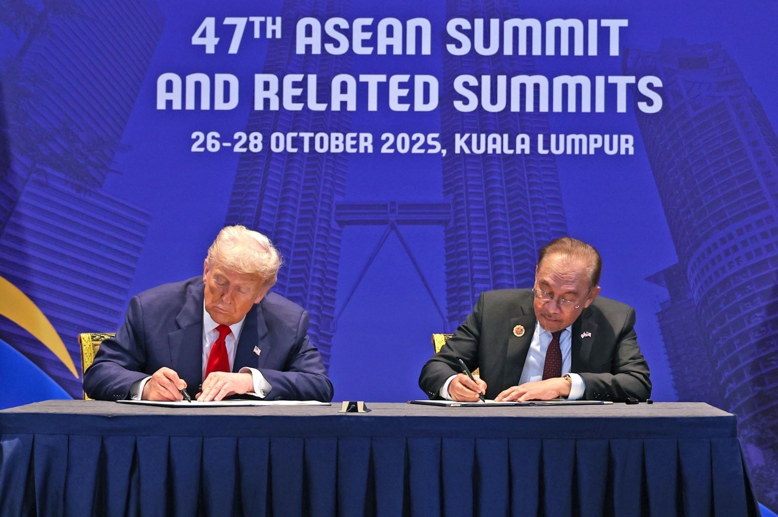Từ Nhật Bản đến Đông Nam Á, Tổng thống Trump đang thúc đẩy hàng loạt thỏa thuận thương mại nhằm củng cố ảnh hưởng Mỹ tại khu vực (trong ảnh: Thủ tướng Malaysia Anwar Ibrahim và Tổng thống Mỹ Donald Trump ký Thỏa thuận thương mại song phương). Ảnh: Bernama