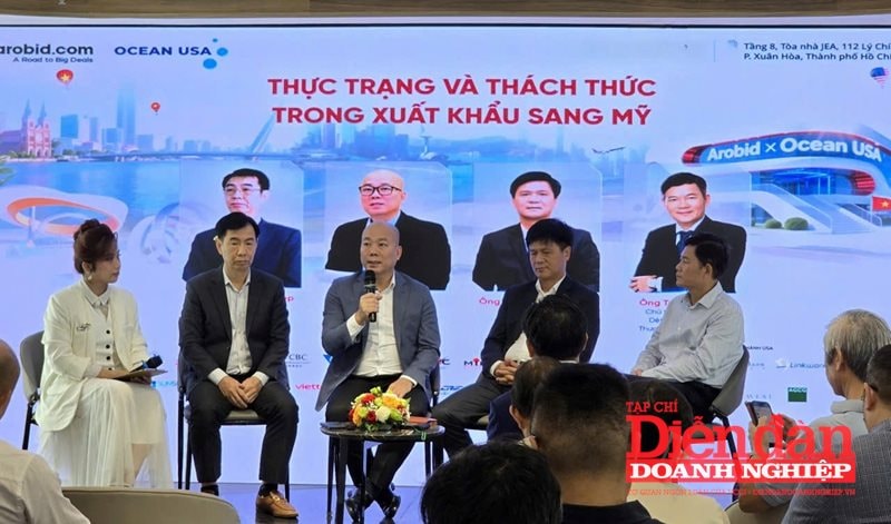 Ông Vũ Bá Phú, Cục trưởng Cục Xúc tiến thương mại, Bộ Công thương (giữa) chia sẻ cùng các doanh nghiệp về các vấn đề xuất khẩu sang thị trường Hoa Kỳ trong bối cảnh thuế quan mới. Ảnh: M.L