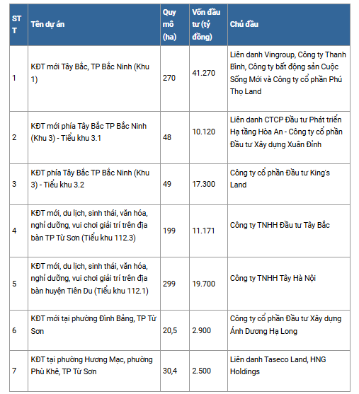 Dự án quy mô lớn nhất là Khu đô thị mới Tây Bắc TP Bắc Ninh (khu 1) do liên danh của Vingroup làm chủ đầu tư. Khu đô thị có diện tích gần 270 ha nằm tại phường Hòa Long, TP Bắc Ninh. Tổng vốn đầu tư của dự án hơn 41.270 tỷ đồng. Các dự án còn lại có quy mô nhỏ hơn tập trung tại TP Bắc Ninh, Từ Sơn, huyện Tiên Du. Tổng vốn đầu tư của 7 dự án trên là 104.961 tỷ đồng.