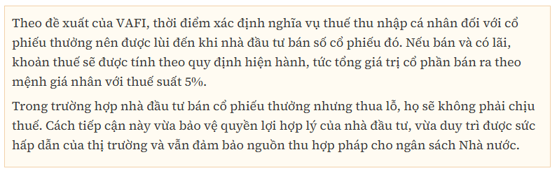 VAFI cũng cho rằng, về nguyên tắc, thuế thu nhập cá nhân chỉ nên áp dụng khi một hoạt động kinh doanh hoặc khoản đầu tư thực sự tạo ra lợi nhuận. Bản chất cơ bản của thuế thuế thu nhập cá nhân là đánh thuế trên thu nhập đã hình thành, chứ không phải trên tài sản hay quyền sở hữu chưa được hiện thực hóa thành tiền.