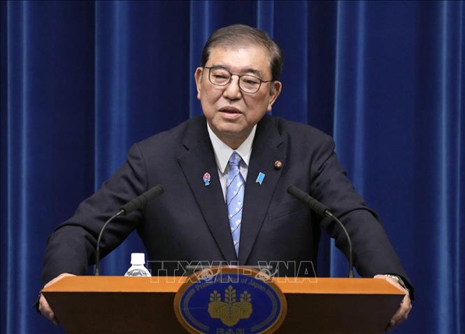 Thủ tướng Nhật Bản Shigeru Ishiba phát biểu tại cuộc họp báo ở thủ đô Tokyo. Ảnh: Kyodo/TTXVN