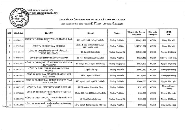 Thuế cơ sở 9 Thành phố Hà Nội thực hiện công khai thông tin 12 tổ chức/cá nhân còn nợ tiền thuế và các khoản thu khác thuộc ngân sách Nhà nước đến thời điểm ngày 26/2/2026.