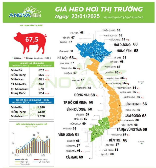 Giá lợn hơi hôm nay 23/01/2025, cận Tết càng hạ nhiệt. Lượng lợn gần Tết được đẩy ra bán nhiều, khiến giá giảm tiếp tại: Bắc Giang và Hà Nội - về 68.000 đồng/kg, miền Bắc mất mốc 69.000 đồng/kg.