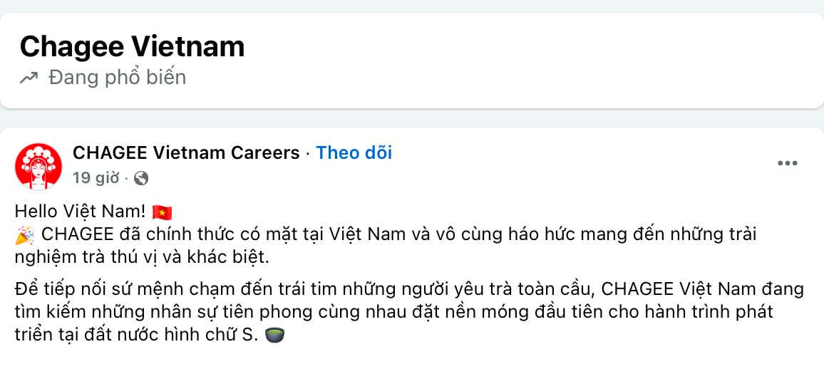 Cụ thể, thương hiệu này đã đăng lên trang Fanpage caption "Việt Nam ơi, hãy cùng nhau sẵn sàng cho những điều thú vị sắp tới nhé! Chagee sẽ đồng hành cùng bạn để mang lại những khoảnh khắc và trải nghiệm đầy mới mẻ. Cùng chờ đón nào!" Không chỉ vậy "kẻ thách thức Starbucks" cũng đã đăng thông tin tuyển dụng nhân sự người Việt.