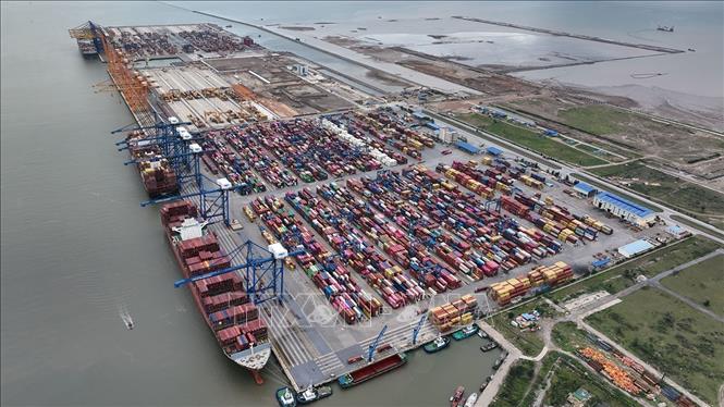 Hoạt động bốc xếp hàng containe tại cảng Hải Phòng, TP Hải Phòng. Ảnh: Vũ Sinh/TTXVN