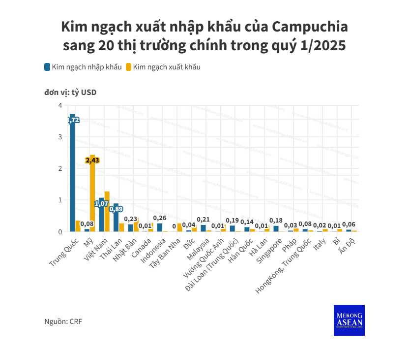 Campuchia nhập khẩu nhiều nhất từ thị trường Trung Quốc trong quý 1/2025, với kim ngạch nhập khẩu đạt 3,72 tỷ USD, chiếm gần 50% tổng giá trị nhập khẩu của quốc gia này.