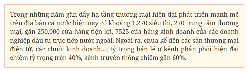 Đặc biệt, cần nâng cao năng lực cạnh tranh của các doanh nghiệp bán lẻ Việt Nam; đa dạng hóa các chủ thể kinh tế và loại hình doanh nghiệp tham gia phát triển thị trường bán lẻ về chính sách hỗ trợ về tài chính, phát triển nguồn nhân lực…