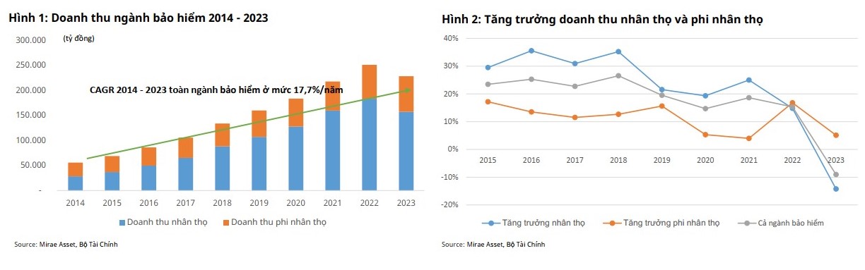 Trong báo cáo ngành bảo hiểm mới đây, Công ty Chứng khoán Mirae Asset cho biết, trong quá khứ, Bảo hiểm là ngành rất tiềm năng và luôn duy trì mức tăng trưởng quanh 20%/ năm. Tuy nhiên, đến năm 2022, khi thị trường tài chính xuất hiện biến cố lớn, doanh thu ngành bảo hiểm đã lần đầu tiên trong hơn 10 năm ghi nhận mức tăng trưởng âm trong năm 2023.
