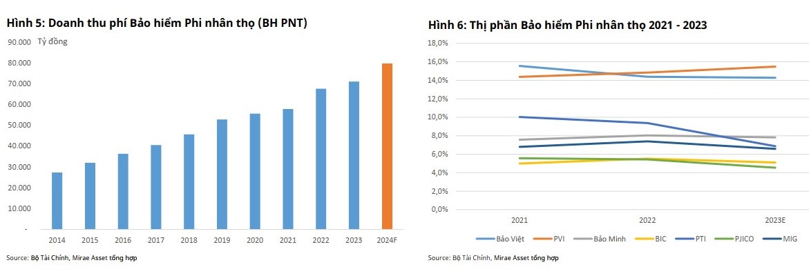 Đối với Bảo hiểm phi nhân thọ, theo Mirae Asset , doanh thu thị trường bảo hiểm phi nhân thọ ước đạt 71.064 tỷ, tăng 5,1% so với năm 2022. Nổi bật là 2 sản phẩm quan trọng là Bảo hiểm sức khỏe, tăng 0,3% và Bảo hiểm xe cơ giới, giảm 1,9% có dấu hiệu ngừng tăng trưởng thì một số sản phẩm khác đã ghi nhận mức tăng trưởng 2 con số như Bảo hiểm tài sản thiệt hại, tăng 11,1%, Bảo hiểm hàng hóa vận chuyển, tăng 10,8%.