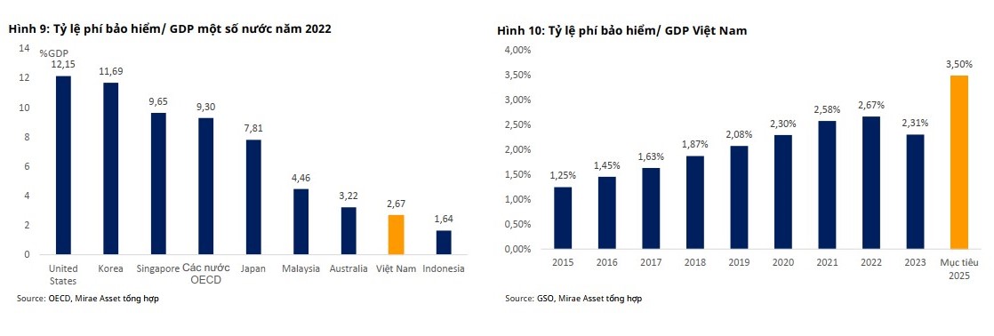 “Theo thống kê của Tổ chức Hợp tác và Phát triển Kinh tế (OECD) vào năm 2022, tỷ lệ GWM tại các quốc gia phát triển như Mỹ có thể lên tới 12%. Một số quốc gia trong khu vực như Singapore, Malaysia cũng ghi nhận tỷ lệ này lần lượt là 9,65% và 4,46%”, Mirae Asset cho biết. Đồng thời nhận định, cùng với triển vọng tăng trưởng kinh tế, tiềm năng phát triển của ngành Bảo hiểm vẫn còn rất lớn.
