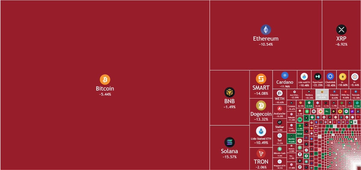 Bitcoin – đồng tiền chủ chốt của thị trường – cũng giảm khoảng 5% trong tuần, mức giảm mạnh nhất kể từ tháng Ba, đưa giá xuống vùng thấp nhất trong dải dao động gần đây.
