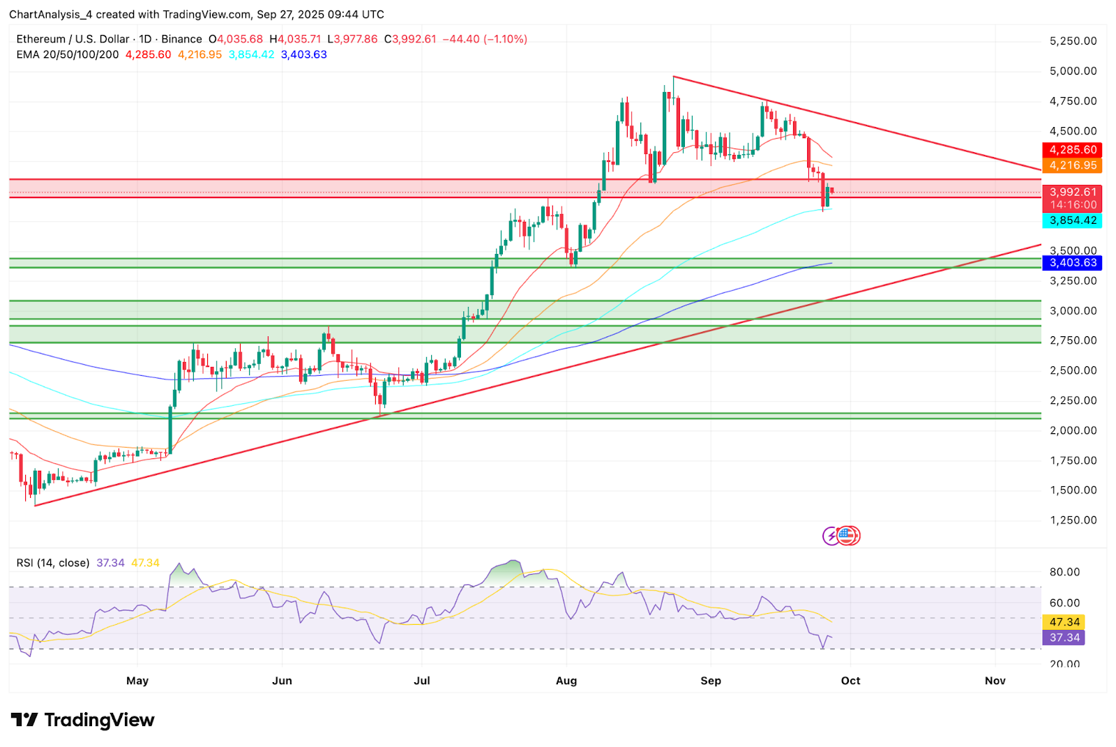 Ethereum – đồng tiền mã hoá lớn thứ hai thế giới – giảm mạnh nhất kể từ tháng Sáu, mất khoảng 12% và rơi xuống dưới mốc 4.000 USD, vốn được coi là ngưỡng hỗ trợ quan trọng.