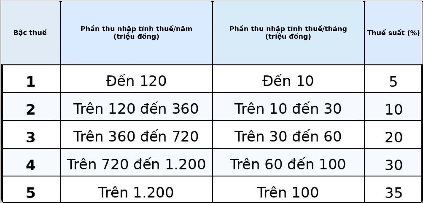+ Bậc 1: thu nhập tính thuế đến 10 triệu đồng, thuế suất 5%: