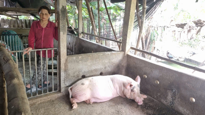 Bà Nguyễn Thị Hai bên chuồng heo của mình