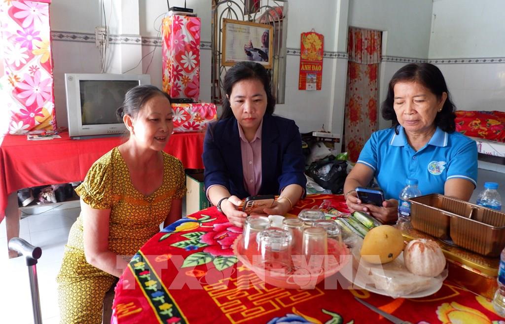 Chủ tịch Hội Liên hiệp Phụ nữ xã Long Cang - chị Hoàng Uyên (bìa trái) thăm tổ hợp may có vay vốn Ngân hàng Chính sách xã hội của chị Lê Thị Giang. Ảnh: Đức Hạnh - TTXVN