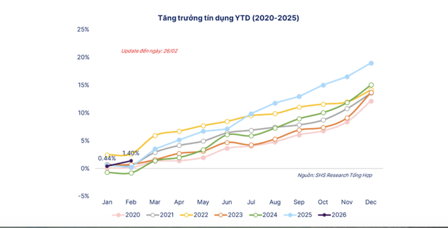 Theo SHS, dù kênh nghiệp vụ thị trường mở vẫn đang duy trì quy mô hỗ trợ lớn, với lượng vốn OMO lưu hành quanh mức 439 nghìn tỷ đồng, đồng thời tiền gửi của Kho bạc Nhà nước trong hệ thống ngân hàng ở mức cao khoảng 468 nghìn tỷ đồng, tăng trưởng tín dụng đến ngày 23/2 mới đạt 2,07%.