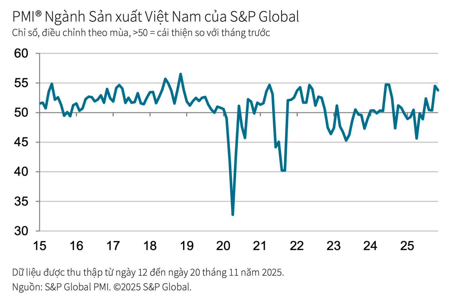 Báo cáo PMI ngành sản xuất Việt Nam tháng 11/2025 do S&P Global công bố cho thấy bức tranh khá tích cực bất chấp thời tiết mưa bão gây nhiều gián đoạn.