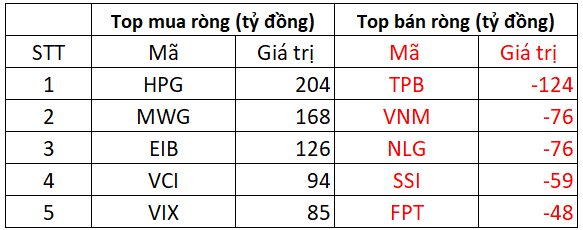 Ngược chiều, cổ phiếu TPB bị bán ròng mạnh tay 124 tỷ đồng, VNM và NLG cùng bị bán ròng với giá trị 76 tỷ đồng. Ngoài ra, SSI bị bán ròng 59 tỷ đồng và FPT bị bán ròng 48 tỷ đồng.