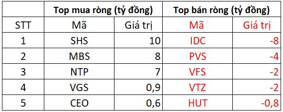 Chiều ngược lại, IDC bị bán mạnh nhất với giá trị 8 tỷ đồng; PVS, VFS và VTZ cũng bị bán ròng với giá trị khoảng vài tỷ đồng mỗi mã.