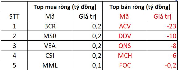 Ngược chiều, cổ phiếu ACV bị bán ròng mạnh tay 23tỷ đồng, DDV cũng bị xả khoảng 10 tỷ. Nhóm NĐT ngoại cũng bán ròng với giá trị vài tỷ đồng tại một số cổ phiếu QNS, MCH.