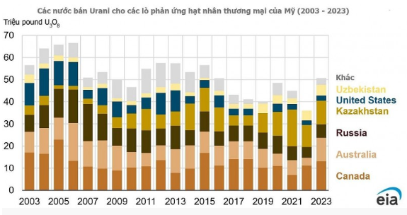 Năm 2023, Mỹ nhập khẩu U3O8 và các sản phẩm tương đương chủ yếu từ Canada (27%), Australia, Nga, Kazakhstan và Uzbekistan.