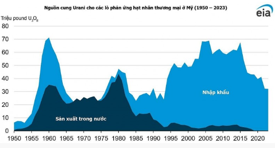 Năm 2023, các nhà máy điện hạt nhân tại Mỹ sử dụng 32 triệu pound (1 pound = 0,4536kg) Urani tinh chế (U3O8) nhập khẩu trong khi chỉ sử dụng 0,05 triệu pound Urani sản xuất trong nước. Như vậy, quốc gia này phải nhập khẩu chiếm tới 99% lượng U3O8 mà các nhà máy điện hạt nhân sử dụng để chế tạo nhiên liệu hạt nhân.