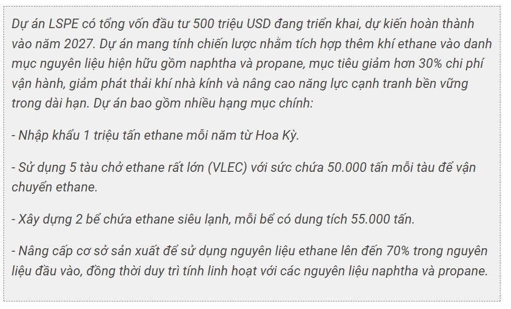 Trước đó, do nhiều nguyên nhân, LSP đã tạm ngừng vận hành sản xuất từ 1.11.2024; sau đó tiến hành đầu tư bổ sung dự án Cải tạo LSP (LSPE) nhằm tăng cường nguyên liệu khí ethane đầu vào nhằm tiết kiệm chi phí.
