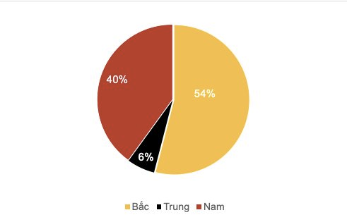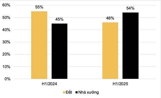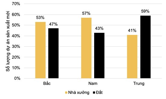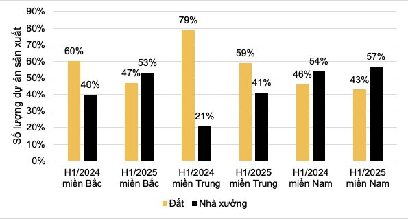 Tỷ lệ dự án nhà xưởng tại các vùng: Miền Bắc đạt 54%, miền Nam 57%, miền Trung 41% (so với 21% cùng kỳ 2024).
