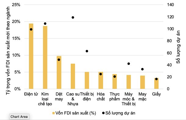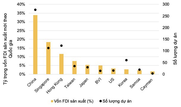 Nhà đầu tư chính: Trung Quốc tiếp tục giữ vị trí dẫn đầu, chiếm 23,4% tổng vốn đăng ký, theo sau là Singapore (15,6%), Hong Kong (12,3%), Đài Loan và Nhật Bản. Trong khi đó, vốn đầu tư từ Mỹ vẫn ở mức khiêm tốn, dưới 5%. Xét về số lượng dự án FDI sản xuất mới, Trung Quốc cũng dẫn đầu với 277 dự án.