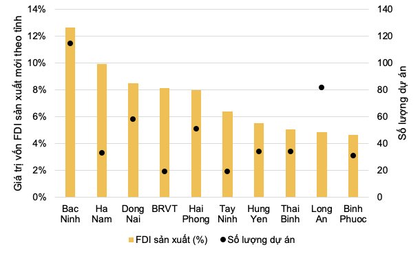 Bắc Ninh, Hà Nam và Đồng Nai là những địa phương nổi bật. Bắc Ninh dẫn đầu với hơn 13% tổng vốn FDI sản xuất mới và sở hữu nhiều dự án nhất (115 dự án). Hà Nam xếp thứ hai với 10% vốn và 33 dự án. Ở khu vực phía Nam, Đồng Nai chiếm 8% với 58 dự án, trong khi Bà Rịa – Vũng Tàu cũng đạt 8% với 19 dự án.