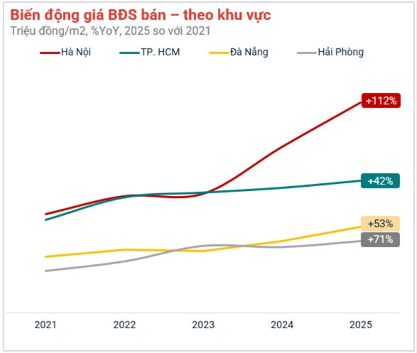 Cụ thể, theo dữ liệu của Batdongsan.com.vn, Hà Nội dẫn đầu về tăng trưởng giá bất động sản trong giai đoạn 2021-2025, với mức tăng tới 112%, theo sau là Hải Phòng tăng 71%. Đại diện của miền Trung là Đà Nẵng cũng gây ấn tượng với mức tăng 53%, trong khi TP.HCM - đầu tàu kinh tế phía Nam ghi nhận mức tăng giá 42% trong vòng 5 năm. Vậy đâu là loại hình bất động sản hay khu vực có tăng trưởng giá tốt nhất tại 4 thành phố kể trên?
