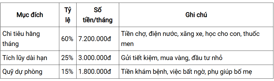 Từ tháng 1/2025, chị Ngọc bắt đầu thử nghiệm chia thu nhập 12 triệu/tháng như sau: