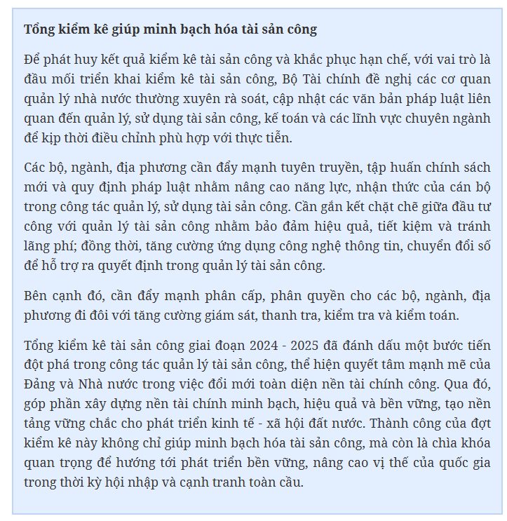 Đặc biệt, số liệu kiểm kê được sử dụng làm thông tin đầu vào quan trọng cho công tác lập kế hoạch đầu tư, mua sắm, điều chuyển và xử lý tài sản công. Nhờ đó, ngân sách được sử dụng tiết kiệm và hiệu quả hơn, giảm thiểu thất thoát và lãng phí.