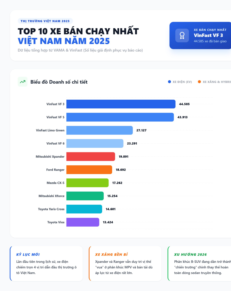 Năm 2025 ghi nhận sự thay đổi lớn trên thị trường ô tô Việt Nam khi VinFast vươn lên dẫn đầu top 10 thương hiệu bán nhiều xe nhất, bỏ xa các đối thủ truyền thống. Theo số liệu tổng hợp, VinFast đạt doanh số 175.099 xe, gần gấp 2,5 lần Toyota, thương hiệu đứng thứ hai với 71.954 xe. Xếp sau lần lượt là Hyundai với 53.229 xe, Ford 50.450 xe và Mitsubishi 44.107 xe, cho thấy sự cạnh tranh gay gắt ở nhóm giữa bảng xếp hạng.