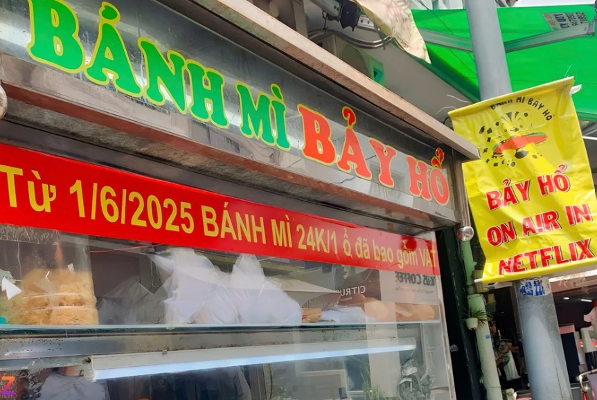Tiệm bánh mì Bảy Hổ trên đường Huỳnh Khương Ninh (quận 1) vừa tăng giá từ 22.000 đồng lên 24.000 đồng một ổ bánh mì, với thông báo dán ngay mặt kính: "Từ 1/6/2025 bánh mì 24K/1 ổ đã bao gồm VAT".