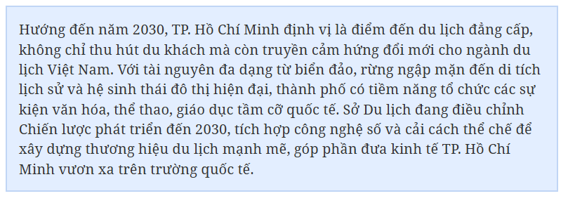 TP. Hồ Chí Minh với vai trò đầu tàu kinh tế cả nước, đang biến du lịch thành động lực quan trọng để thúc đẩy tăng trưởng bền vững. Sở hữu nguồn tài nguyên văn hóa, lịch sử và hạ tầng hiện đại, thành phố đặt mục tiêu trở thành trung tâm du lịch hàng đầu Đông Nam Á vào năm 2030, tạo ra giá trị kinh tế lớn và nâng cao vị thế trên bản đồ quốc tế.