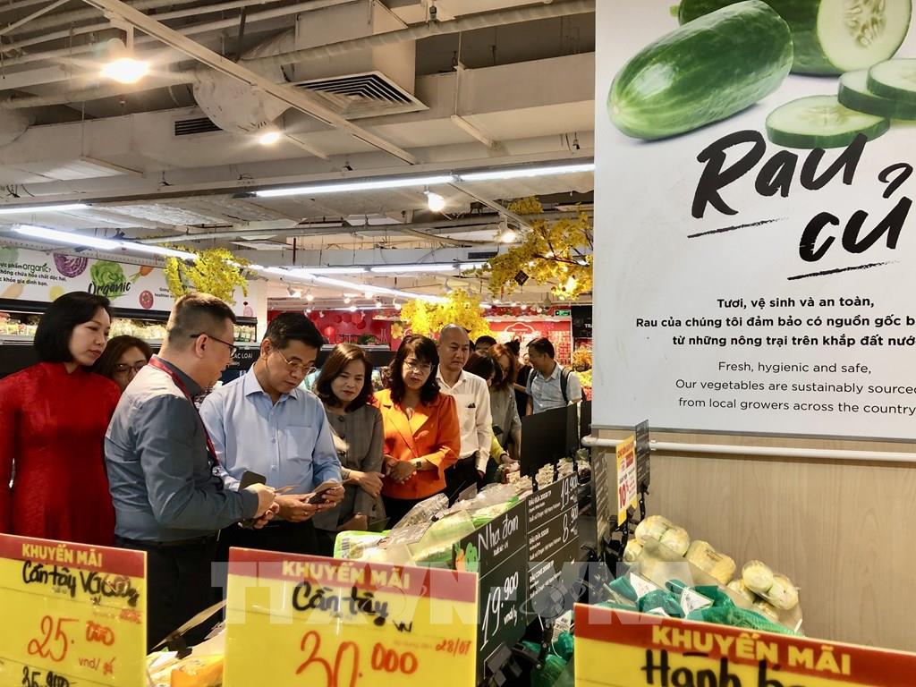 Đoàn công tác kiểm tra nhóm hàng rau củ tại điểm bán lẻ Thành phố Hồ Chí Minh. Ảnh: Mỹ Phương – TTXVN