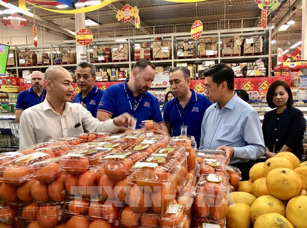 Đoàn công tác kiểm tra nhóm mặt hàng trái cây tại MM Mega Market An Phú. Ảnh: Mỹ Phương – TTXVN