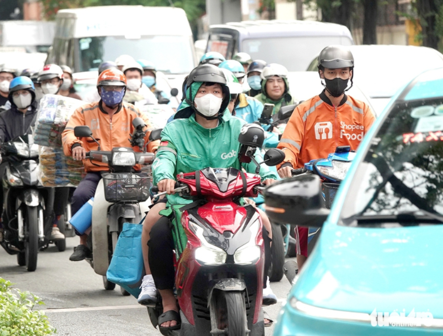 Các shipper chạy xe máy xăng chở khách và chở hàng lưu thông ở TP.HCM vào chiều 20-7 - Ảnh: T.T.D