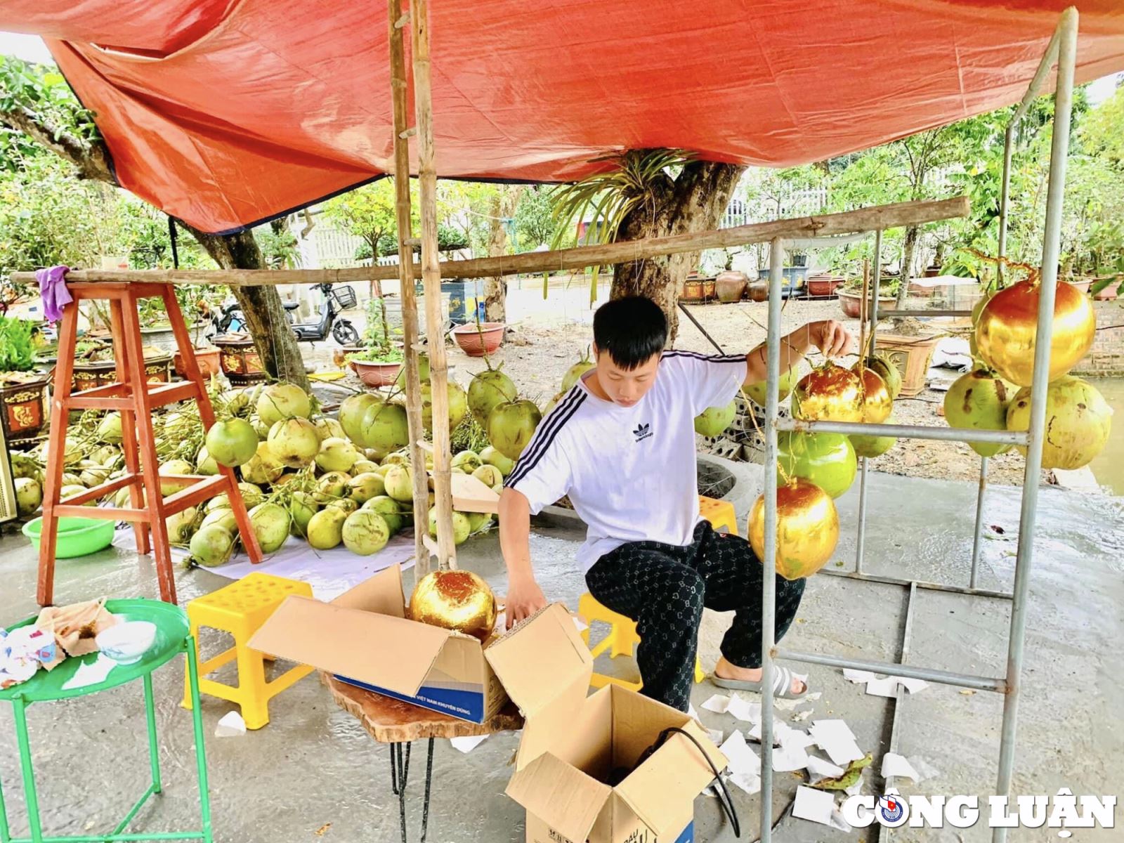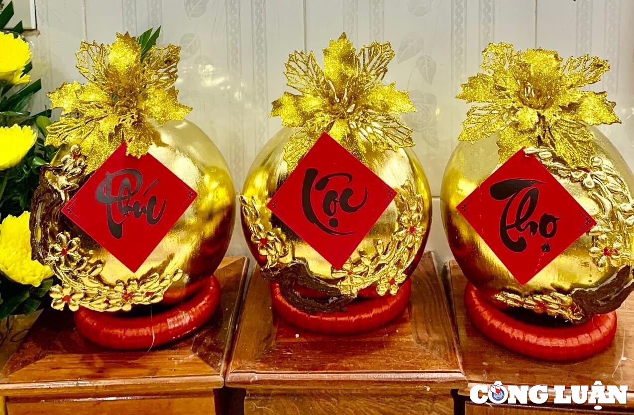 Tiếp theo, vệ sinh quả sạch sẽ và quét keo, khi keo khô thì tỉ mỉ dùng lá vàng phủ đều lên trái. Kế tiếp, người thợ dùng cọ phủ nhẹ để phần vàng thừa rớt xuống. Đánh lại và xịt keo lên bề mặt quả cho láng mịn và láng bóng. Cuối cùng là gắn thêm các phụ kiện trang trí với hình ảnh cá chép hóa rồng, chữ Tài, chữ Lộc...