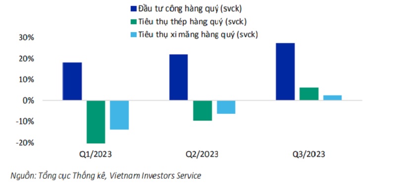 Cụ thể, dựa trên kế hoạch của Chính phủ, giá trị đầu tư công sẽ tăng 15% vào năm. Do đó, chúng tôi kỳ vọng giải ngân đầu tư công sẽ tiếp tục tăng ít nhất 10% trong năm 2024, cải thiện điều kiện kinh doanh cho ngành xây dựng và vật liệu, thể hiện qua sự tăng trưởng của ngành thép và xi măng trong quý III//2023. Điều kiện kinh doanh sẽ dần cải thiện sức mạnh tài chính của các công ty trong ngành.