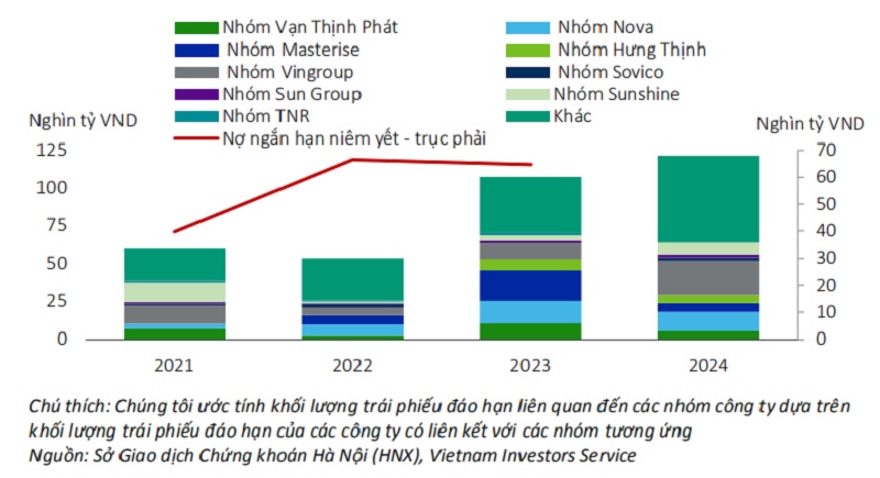 Ngoài ra, lượng trái phiếu đáo hạn vào năm 2024 của ngành bất động sản sẽ đạt mức cao nhất với trên 120 nghìn tỷ VND.