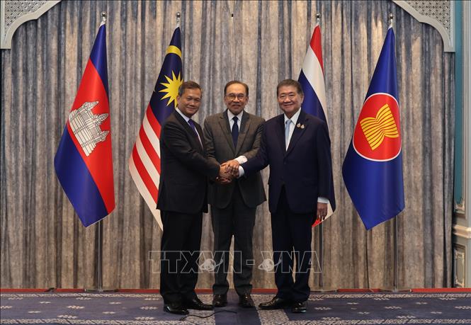 Thủ tướng Campuchia Hun Manet (ngoài cùng bên trái), Thủ tướng Malaysia Anwar Ibrahim (giữa) và Quyền Thủ tướng Thái Lan Phumtham Wechayachai trong cuộc họp báo tại Putrajaya, Malaysia. Ảnh: THX/TTXVN