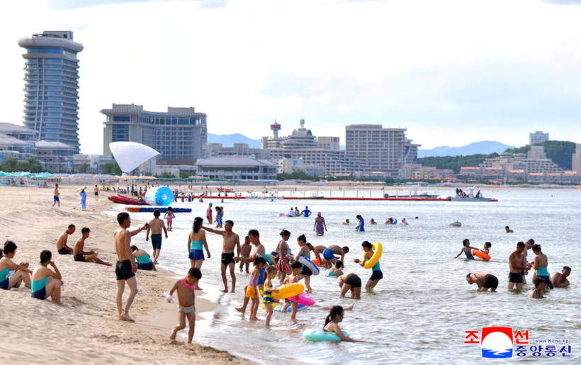 Du khách nội địa tham quan bãi biển tại Khu du lịch ven biển Wonsan Kalma ở Wonsan, Triều Tiên vào ngày 1/7. Ảnh: AFP.