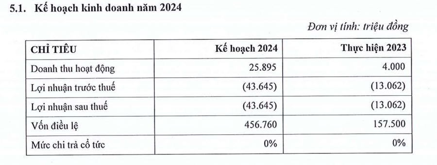 Theo tài liệu họp Đại hội đồng cổ đông thường niên 2024, Chứng khoán CV (CVS) đặt kế hoạch doanh thu gần 25, 9 tỷ đồng, gấp gần 5,5 lần so với cùng kỳ năm ngoái. Tuy nhiên, Công ty đặt mục tiêu lỗ sau thuế 43,6 tỷ đồng, tăng so với mức lỗ 13 tỷ đồng năm trước. Đồng thời, không trả cổ tức năm 2023 và 2024.