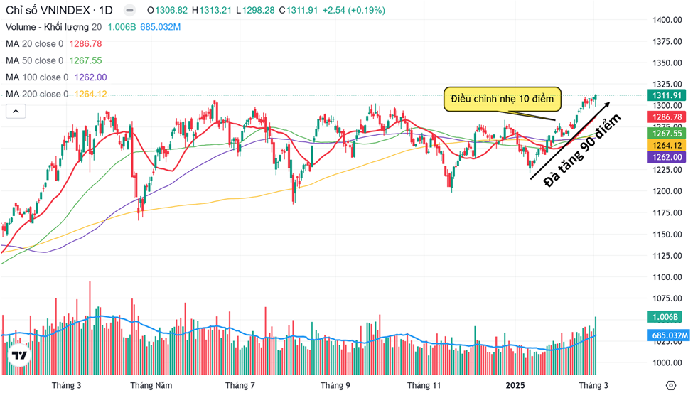Trong ngắn hạn, nếu thị trường có nhịp điều chỉnh để test lại vùng 1300 nhằm cân bằng cung cầu thì cũng là diễn biến tự nhiên. Đây có thể xem là cơ hội, thay vì rủi ro, bởi nền tảng lợi nhuận của doanh nghiệp vẫn đang hỗ trợ cho xu hướng đi lên.