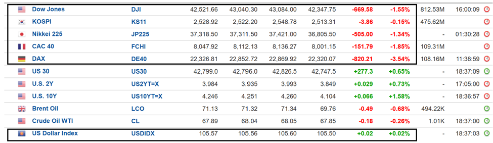 Theo đó, lợi suất trái phiếu kỳ hạn 2 năm, 10 năm đồng loạt giảm, đặc biệt đồng Đô (DXY) giảm mạnh về 105,5 (từ mức 110). Ngược lại Vàng tăng lên trong bối cảnh rủi ro căng thẳng thuế quan leo thang.