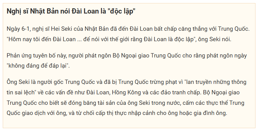 Ngày 6-1, Trung Quốc tiếp tục có động thái phản ứng với Nhật Bản liên quan đến vấn đề Đài Loan.