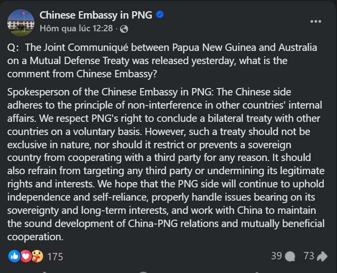 Trong bài đăng trên mạng xã hội Facebook hôm 18/9, Đại sứ quán Trung Quốc tại Papua New Guinea khẳng định tôn trọng quyền ký kết hiệp ước song phương của quốc gia này, song nhấn mạnh rằng bất kỳ thỏa thuận nào cũng không nên mang tính “độc quyền” hoặc hạn chế khả năng hợp tác với bên thứ ba.