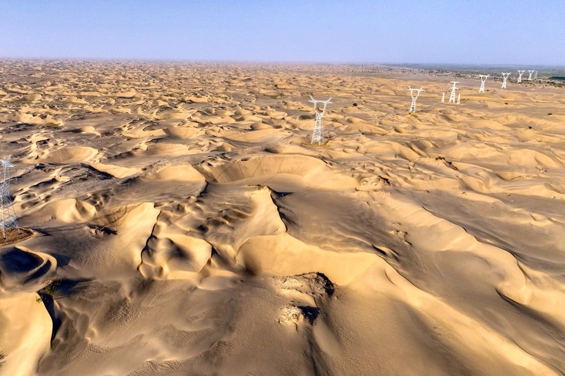 Một đoạn của dự án truyền tải và chuyển đổi 750kV đi qua sa mạc Taklamakan ở lưu vực Tarim thuộc khu vực Tân Cương, phía tây Trung Quốc. Ảnh: Xinhua.